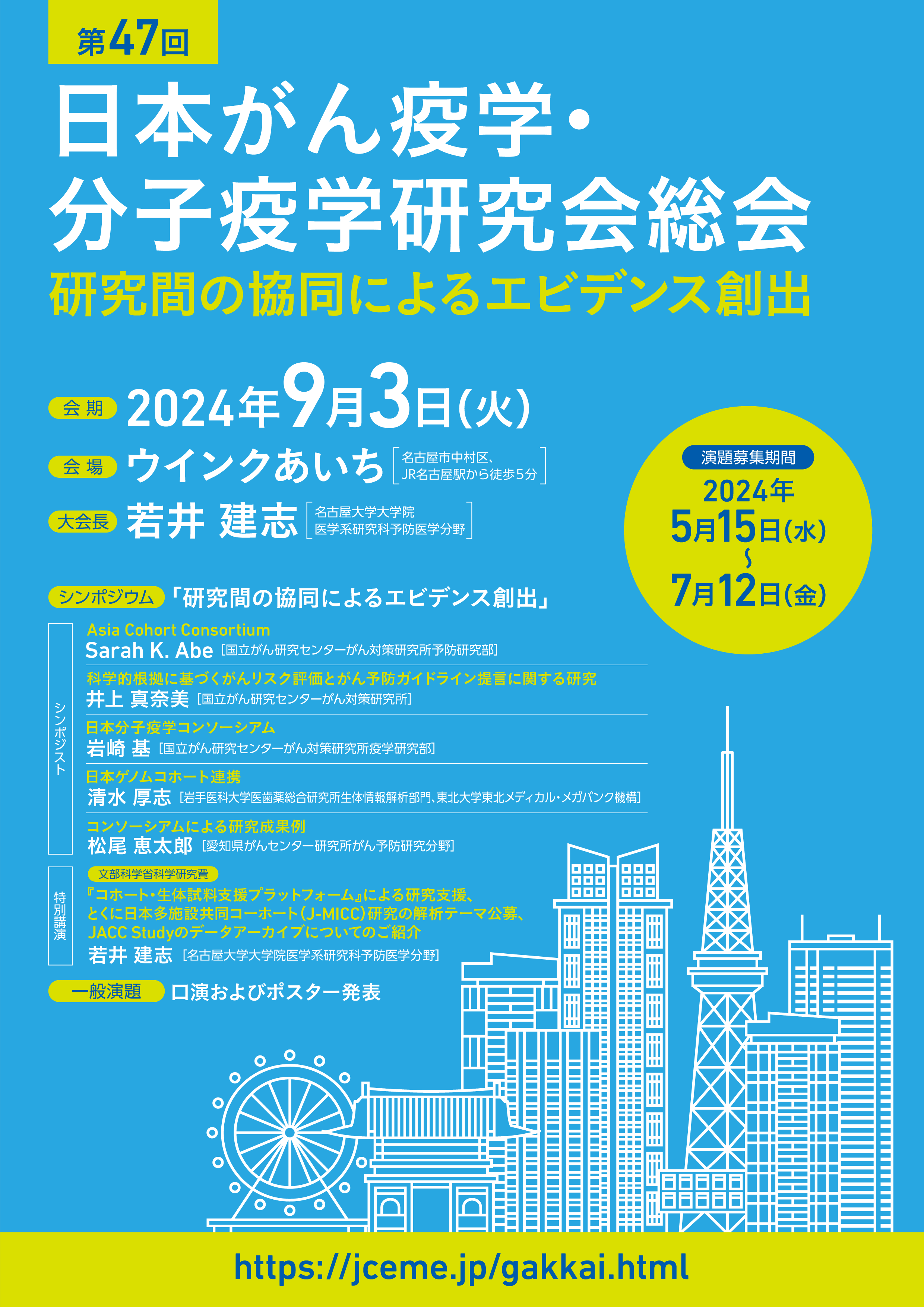今年の日本がん疫学・分子疫学研究会総会は、9月3日(火)にウインクあいち(名古屋市、JR名古屋駅から徒歩5分)にて開催いたします。